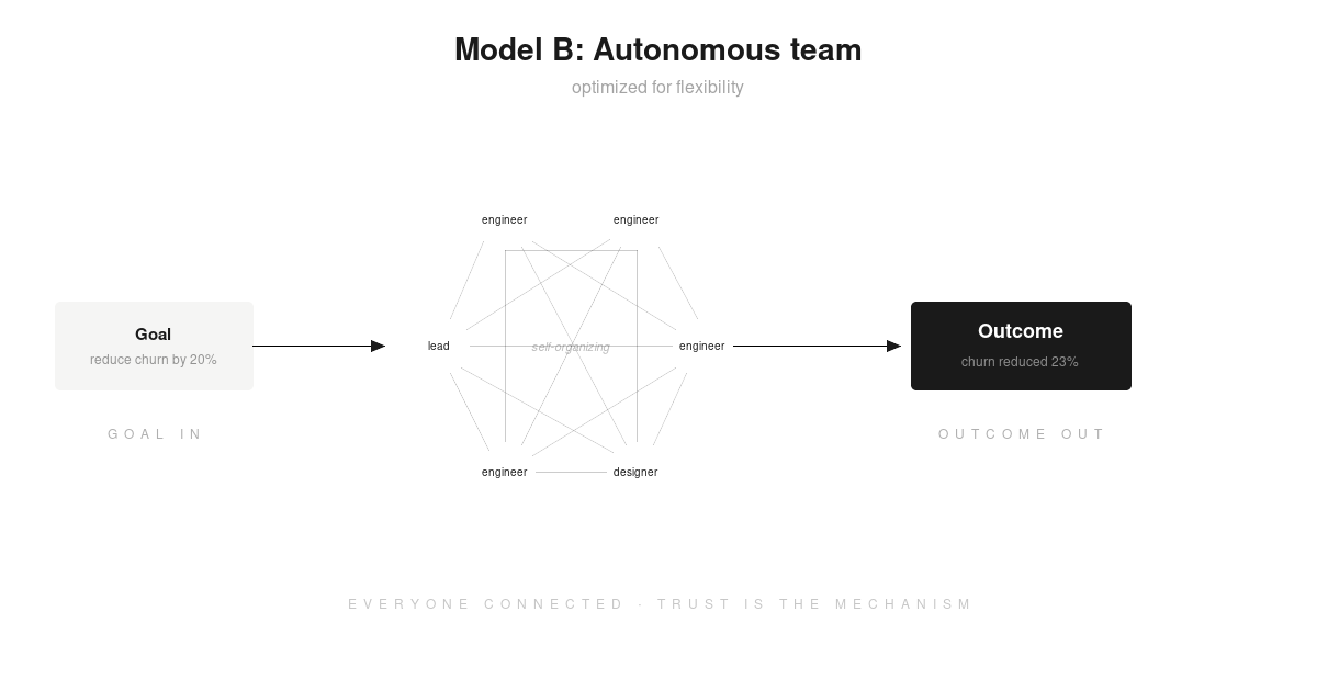 An autonomous team is a group that self-organizes around problems. Work does not arrive as tasks — it arrives as goals. "Reduce churn by 20%." "Improve the onboarding experience." "Figure out why customers are leaving after the trial." The team decides what to build and how.