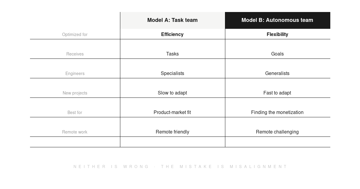 There are two kinds of engineering teams: task teams optimized for efficiency, and autonomous teams optimized for flexibility. Most companies think they're running the second. Most are running the first. Here's how to tell — and why the misalignment costs you your best people.