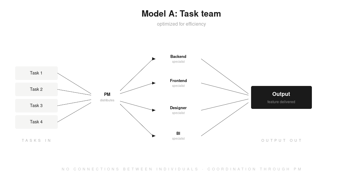A task team is a group of individual contributors with a coordinator. Work comes from outside the team — from stakeholders, product managers, or leadership — already broken down into tasks. The team executes, delivers, and moves to the next task.
